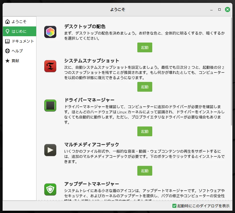 この後は、「ようこそ」の「はじめに」に表示される項目を、上から順番に実行していきます