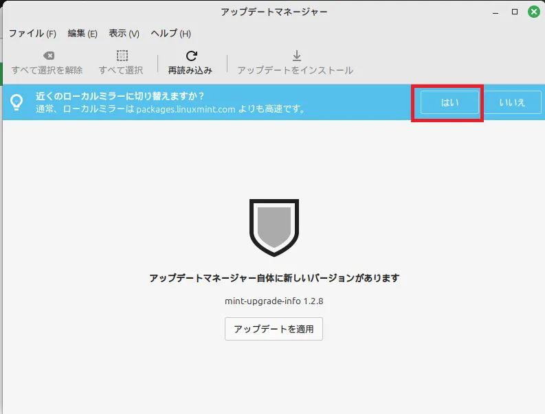 ここで、「近くのローカルミラーに切り替えますか?」と聞いてきますので「はい」を選択します。