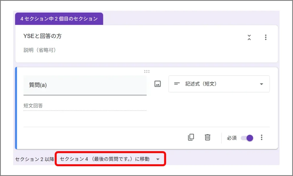 - 右下の「︙」メニュー → 「回答に応じてセクションに移動」 を選択