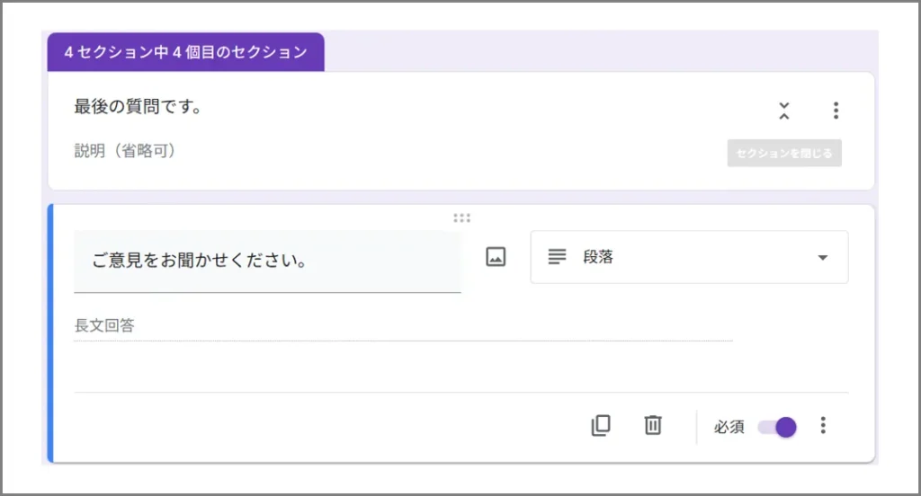 このように「セクション」と「回答に応じた移動」を組み合わせることで、YES/NOで分岐させ、最後は共通の質問に合流させる流れ を作ることができます。