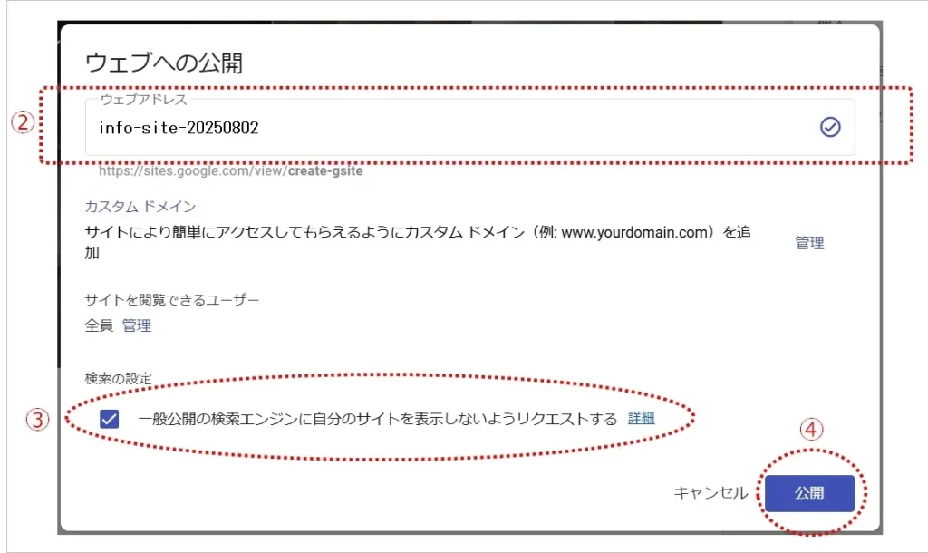 ウェブアドレスの部分に任意の文字列を英数字で入力。これがサイトURLの一部となりますので、象徴的な文字列をいれましょう。今回は「info-site-20250802」としました。