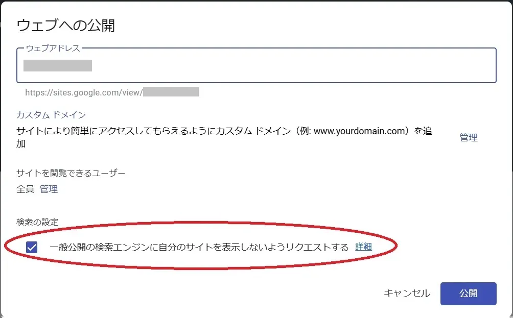 限定サイトにするためには、Googleなどの検索エンジンに登録されたくありませんので、「一般公開の検索エンジンに自分のサイトを表示しないようリクエストする」のチェックをONにします。
