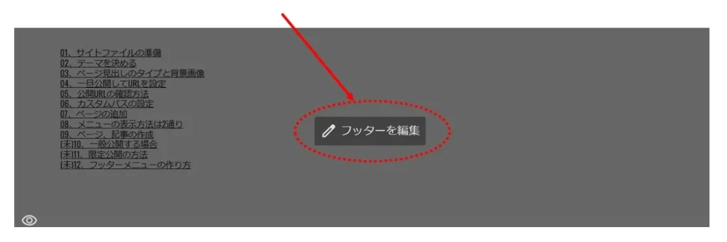 任意のページの最下部に移動しマウスポインタを下の方に合わせると、「フッターを編集」というボタンが出てきますのでクリックします。