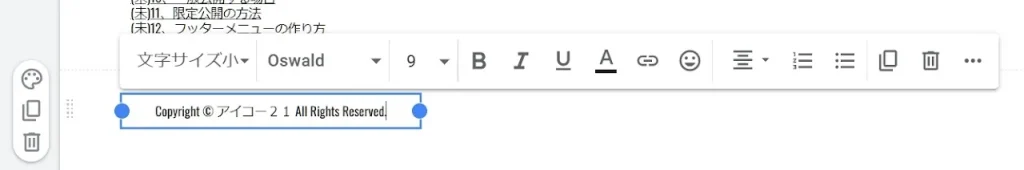 ここでは、「Copyright © アイコー21 All Rights Reserved.」と記入、フィールドを左側に寄せて幅を狭くしました。