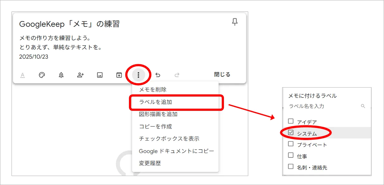 - 3点メニュー(その他メニュー)から「ラベルを追加」を選択し、該当するラベルにチェックをつけます。
