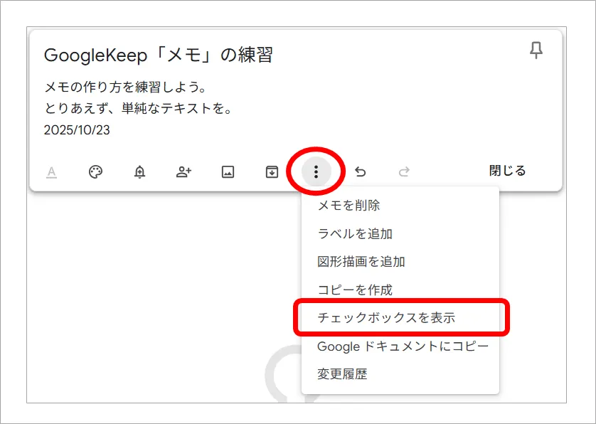 - 先ほどと同様にタイトルを入力し、3点メニューより「チェックボックスを表示を選択」します。