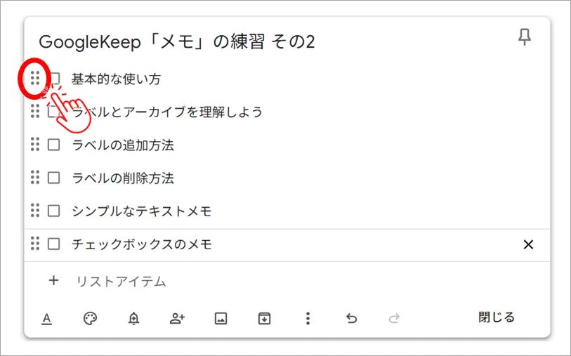 - リストの順番を変えたい場合は、ドラッグハンドル(並べ替えハンドル)をクリックしながら移動します。