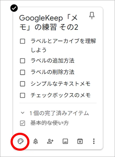 ①メモにマウスポインターを重ねると、下部にメニューが現れますので、パレットマークをクリックします。